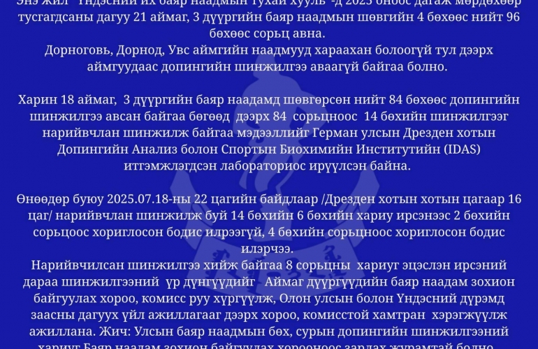 Аймаг, дүүргийн баяр наадмын шөвгийн 4 бөхчүүдээс сорьц авчээ. Нийт 84 сорьцоос 14 бөхийн шинжилгээг нарийвчлан шинжилж үзэхэд 4-ийнхөөс нь хориглосон бодис илэрсэн талаар Монголын Үндэсний Бөхийн холбооноос мэдээллээ.